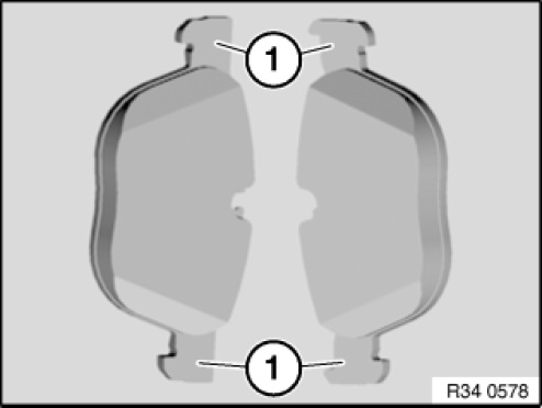 So as not to damage the surface coating, if possible do not mechanically clean the guide surfaces for the brake pads on the brake caliper mounting bracket. Instead, clean with brake cleaner BMW part no. 83 19 2 154 780 and apply a thin coating of brake pad paste BMW part no. 83 19 2 158 851.