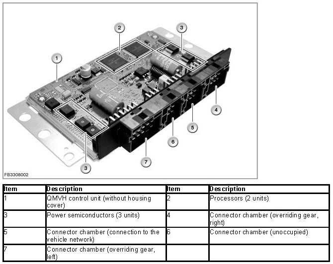 The additional actuators on the rear axle differential are activated by the QMVH control unit ("QMVH" stands for "rear axle lateral torque distribution"). There are 2 processors built into the QMVH control unit. One processor activates the left-hand electric motor, the other processor activates the right-hand electric motor. In addition, each processor monitors the output signals of the other processor.