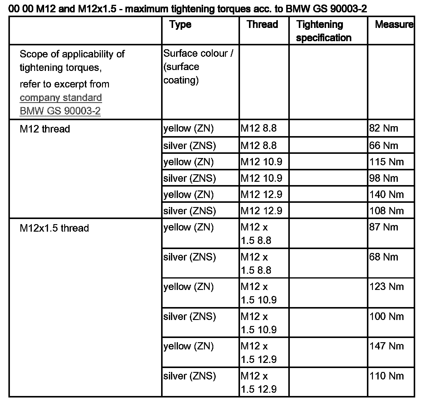 00 00 ... M12 and M12x1.5 - Maximum Tightening Torques Acc. to BMW GS 90003-2