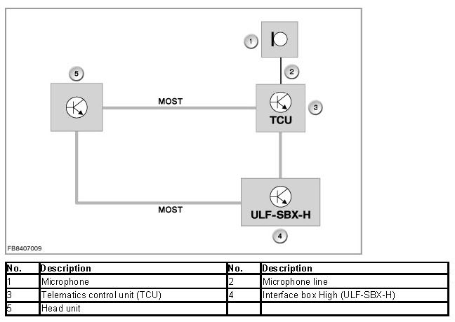 If there is a parallel installation of Telematic Control Unit (TCU) and ULF-SBX-H in the vehicle, the vehicle microphone is connected to the TCU. All telephone functions are implemented via the TCU. The ULF-SBX-H provides the voice recognition system as well as other functions (depending on vehicle equipment). Diagnosis of the vehicle microphone is implemented within the framework diagnosis of the TCU.