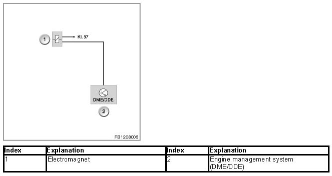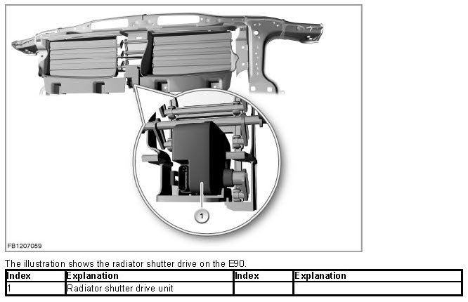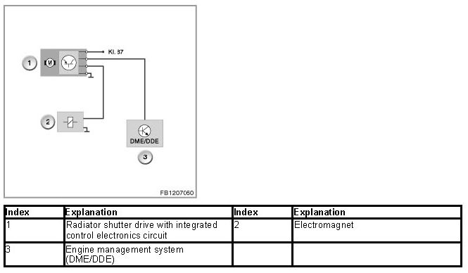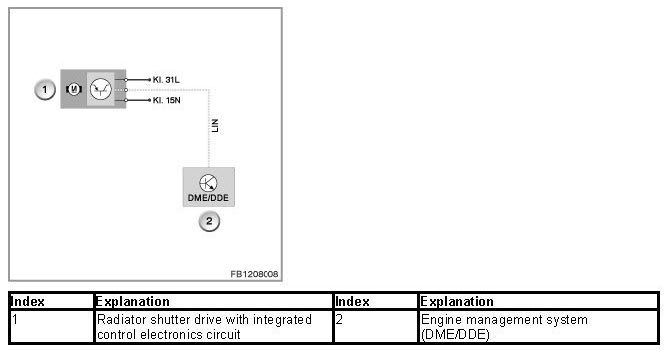 The radiator shutter drive is activated via the LIN bus by the engine management system (DME or DDE). The radiator shutter drive and electromagnet are supplied with voltage via terminal 15N.