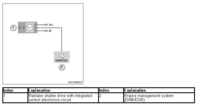 The radiator shutter drive is activated via a pulse-width modulated signal (PWM signal) from the engine management system (DME or DDE). The radiator shutter drive is supplied with voltage via terminal 87.