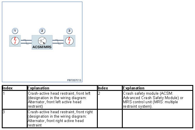 All gas generators, pyrotechnic components and sensors are connected directly to the crash safety module or MRS control unit. The crash safety module or MRS control unit evaluates the data of the sensors. In the case of a crash, the crash safety module or MRS control unit decides whether it is necessary to trigger the seat belt tensioner and airbags and what airbags need to be deployed. The crash safety module or MRS control unit also triggers the Crash Active head restraints.