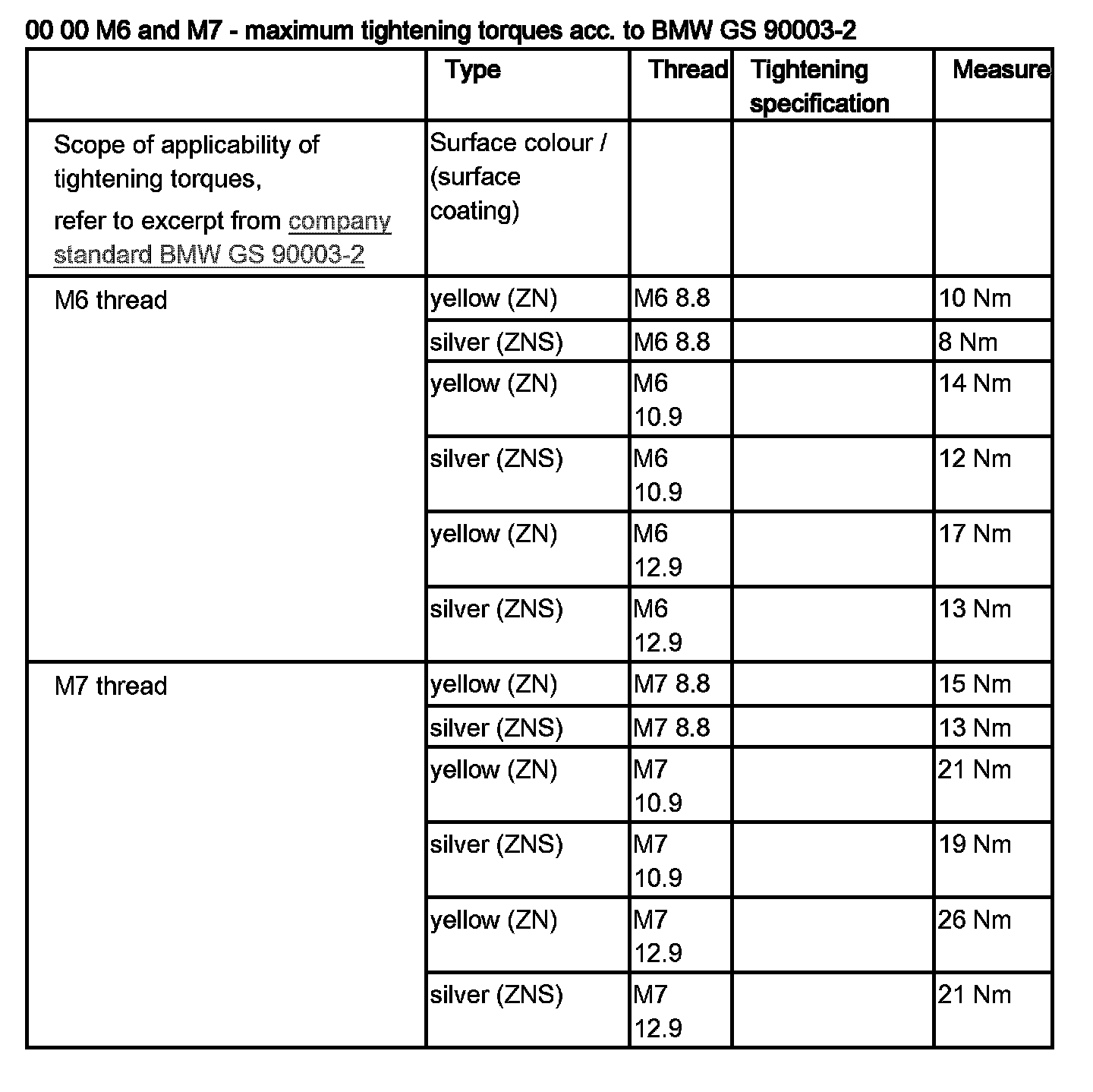 00 00 ... M6 and M7 - Maximum Tightening Torques Acc. to BMW GS 90003-2