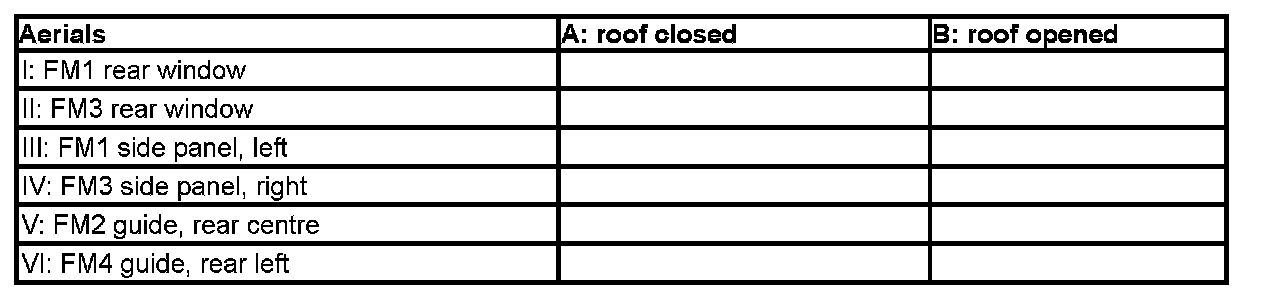 - The measured values of the aerials in the side panels behave in precisely the opposite manner to the measured values of the rear-window aerial, i.e. with the roof closed smaller field strength values must be measured than with the roof opened.