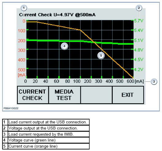 NOTE: It is not necessary to connect the IMIB to the network or an ISID in order to carry out the USB test. The results of the USB tests are not included in the diagnosis report. The USB tests must be used as independent tools for diagnosing vehicle belonging to the BMW group. The testing of other USB components (PC, data carriers, accessories etc.) is not permitted and could cause permanent damage to the IMIB. The tested USB connection is only fully functional if both tests can be successfully completed. Only the electrical test (current check) for voltage and current can be carried out at the USB connection in the glove compartment (not the media test). If one of the two tests is not performed successfully, a vehicle diagnosis must be carried out with the ISTA! Warranty-related invoicing can only take place after a full diagnosis has taken place.