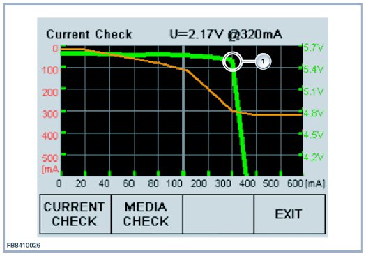 During the test, the load current of the USB connection is increased in steps, and the voltage is measured at the USB connection at the same time. These values are shown graphically on the display of the IMIB.