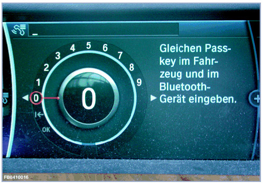NOTICE: Vehicle E46, E83, E53, E85, E86, E65, E66, E67, E68 and RR1, RR2, RR3 (depending on equipment) are equipped with a fixed Bluetooth passkey. For the vehicles the entry of the Bluetooth passkey in the vehicle is dispensed with. The Bluetooth passkey to be used is found in the vehicle documentation or on the label on the control unit. This can additionally be read out via the control unit functions of the telephone control unit.