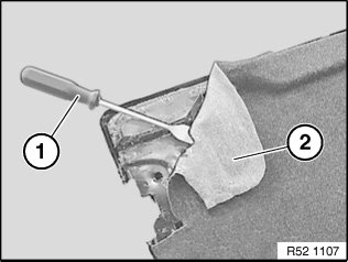 Detach rear panel (2) with flat scraper (1) from rear seat back.