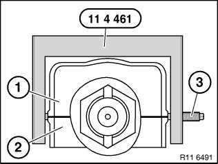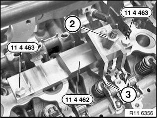 Mount special tools 11 4 461 with screw (1) to inside of cylinder head.