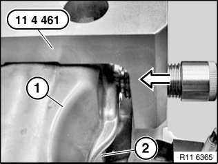Schematic depiction of special tool 11 4 461 at upper bearing strip (1) and lower bearing strip (2).