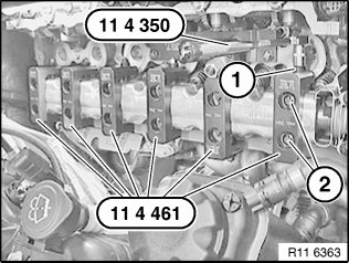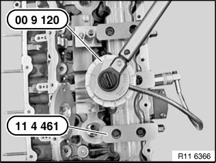 Mount special tool 11 4 461 with screw facing outwards on cylinder no. 2.