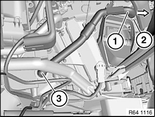 If necessary, disengage bleed hose (1) from clamp (2) and detach at point (3) from the heating and air conditioning unit.