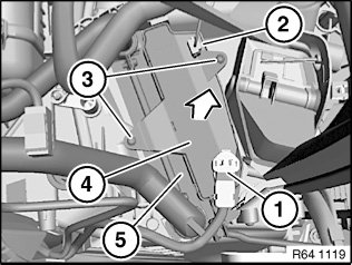 Remove electric auxiliary heater (4) in direction of arrow from the heating and air conditioning unit (5).