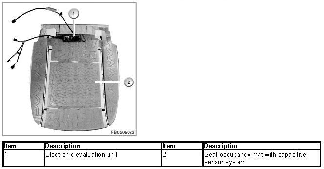 The passenger seat occupancy detection consists of a seat-occupancy mat with a capacitive sensor system. The occupancy of the front passenger seat is detected by measuring the resistance of the human body.
