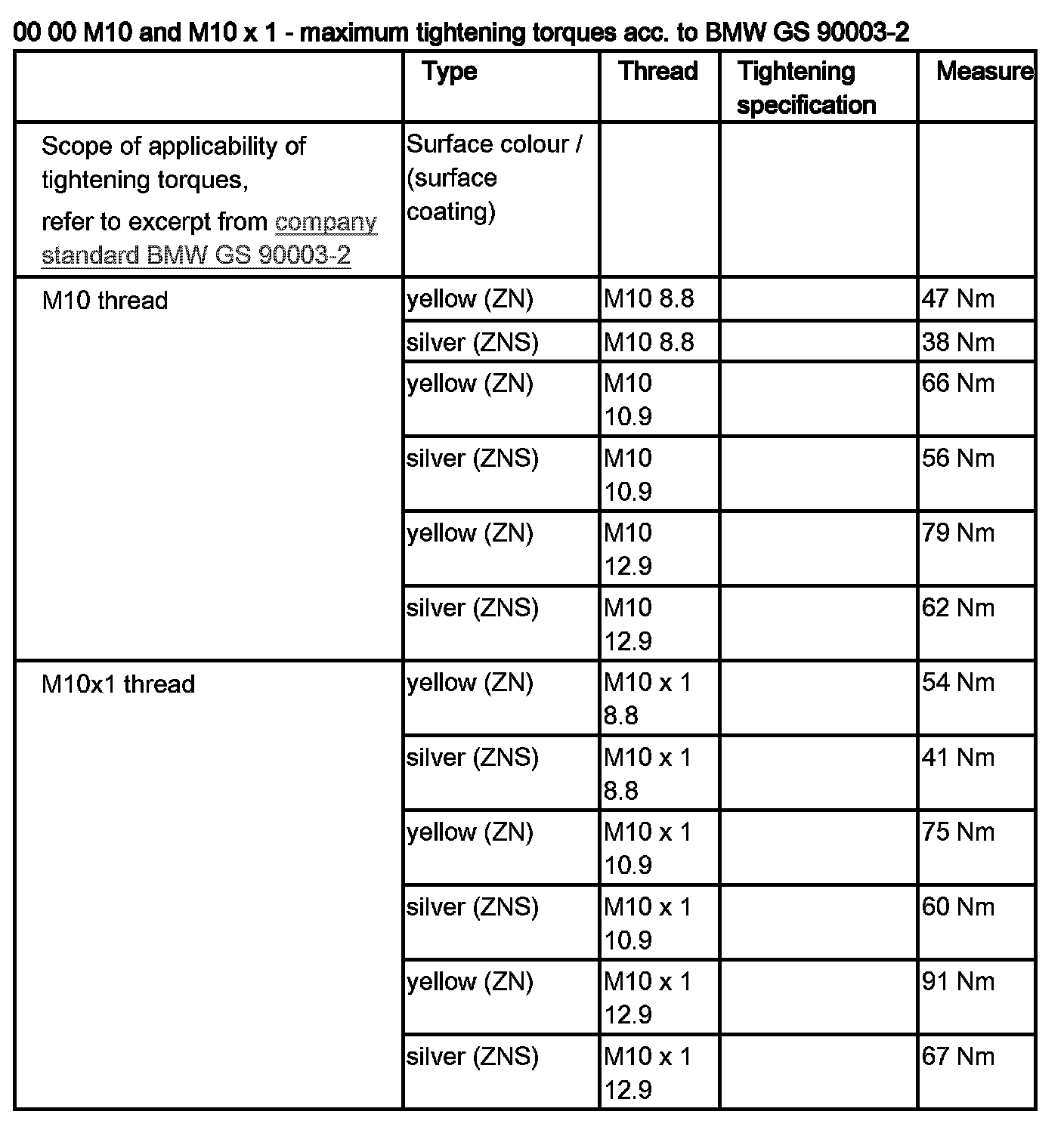 00 00 ... M10 and M10 x 1 - Maximum Tightening Torques Acc. to BMW GS 90003-2