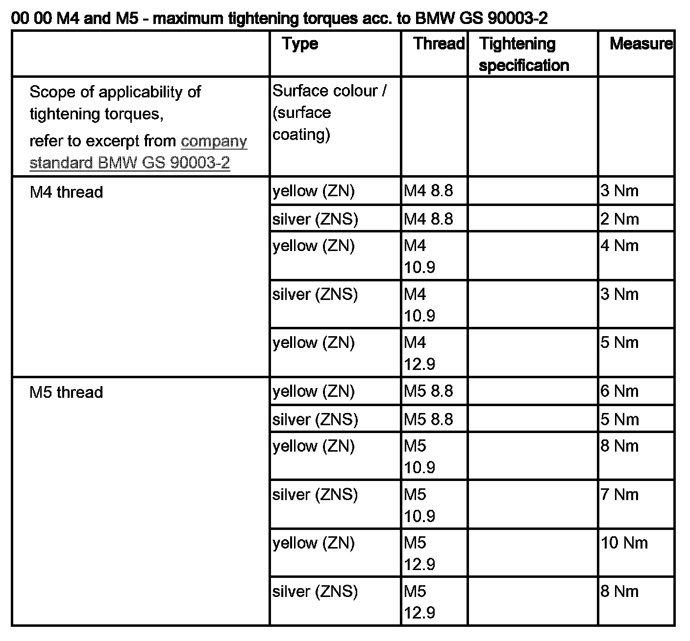 00 00 ... M4 and M5 - Maximum Tightening Torques Acc. to BMW GS 90003-2