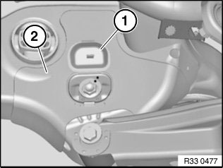 If necessary, open cover (1) on stoneguard (2). Mark position of eccentric bolt to rear axle support.