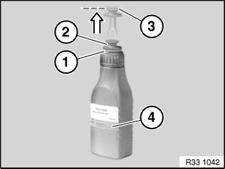 Insert the filler neck into the oil filler opening in the rear axle final drive and position the bottle below the output shaft. Squeeze the bottle (4) to fill. Fill the rear differential unit until the special oil escapes from the oil fill opening.