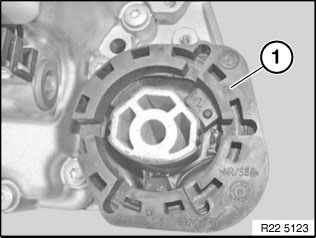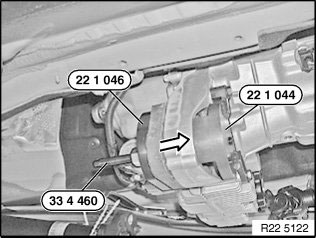 Insert special tool 22 1 046 with pins into opening of rubber mount.