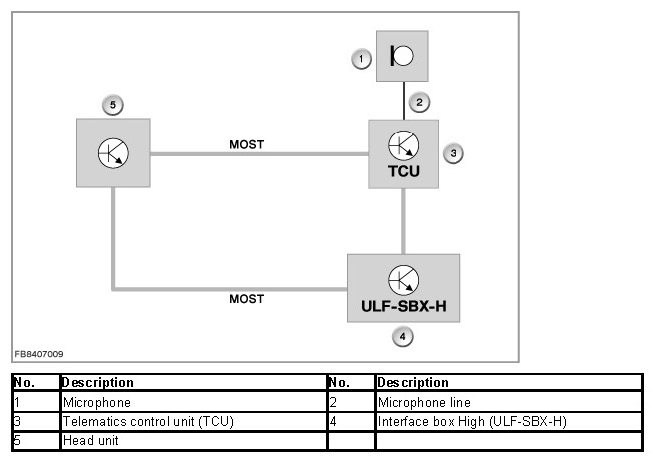 If there is a parallel installation of Telematic Control Unit (TCU) and ULF-SBX-H in the vehicle, the vehicle microphone is connected to the TCU. All telephone functions are implemented via the TCU. The ULF-SBX-H provides the voice recognition system as well as other functions (depending on vehicle equipment). Diagnosis of the vehicle microphone is implemented within the framework diagnosis of the TCU.