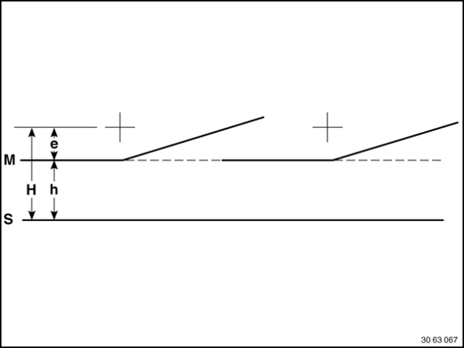 - Align headlight aimer with vehicle longitudinal axis and parallel to parking surface. Set marking line (M) on aimer to distance (e). Scale graduations on aimer are equal to a gradient in cm at a distance of 10 meters.