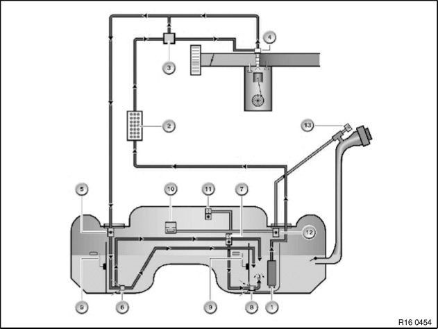 The filler vent valve in the tank is closed by the rising fuel if the tank is overfilled. The residual volume thus created replaces the expansion tank. The ventilation function is maintained by a second float valve.
