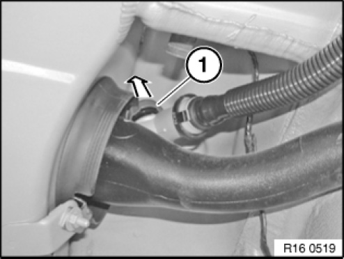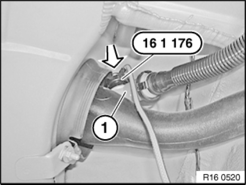 Attach special tool 16 1 176 vertically from above to valve on fuel filler pipe (1).