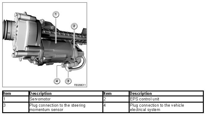 The EPS control unit is part of the electromechanical power steering. The EPS control unit is connected with 2 plug connections to the vehicle power system. The steering momentum sensor is connected via another plug connection at the EPS control unit.