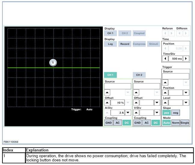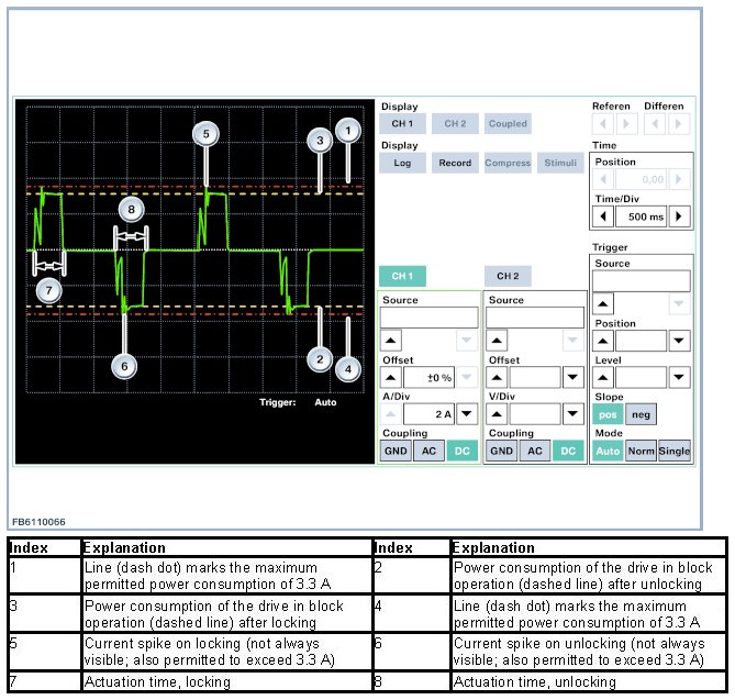 For evaluation of the characteristic curve, the measured power consumption of the central locking drive must be examined in block operation. The power consumption in block operation must not exceed 3.3 A.