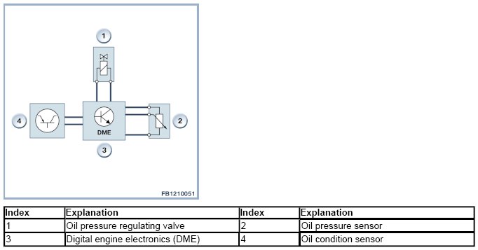 The Digital Engine Electronics (DME) evaluate these measured variables. With the oil condition sensor, the electrical properties of the engine oil are also determined. The characteristics change with wear of the engine as well as changes to the engine oil (for example, ageing, deposits).