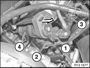 Partially remove throttle body (4) and unlock tank ventilation line (2) and remove.
