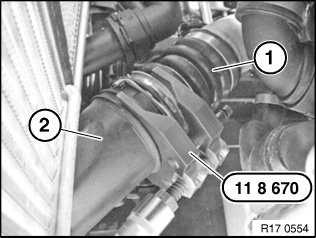 ^ Attach charge air duct (1) with special tool 11 8 670 to charge air cooler (2).
