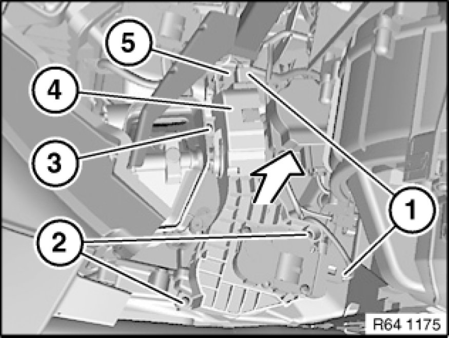 Detach bracket (4) complete with servodrives from heater/air conditioner (5).