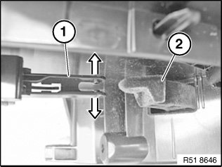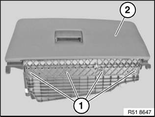 Unclip damper rod (1) from glove box lid retaining bracket (2) and slide back in direction of arrow.