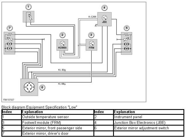 The JBE is responsible for the voltage supply to the electrical exterior mirrors and exterior mirror adjustment switch. With the equipment specification "Low", the JBE electrically activates the mirror heating. Depending on the outside temperature, the JBE receives a signal to warm up the mirror heating. The JBE receives the signal via the K-CAN.