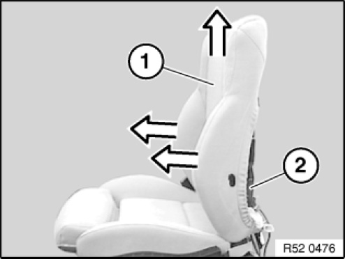 Pull off backrest cover (1) with upholstery towards top from backrest frame (2).