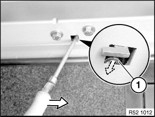 Press screwdriver to centre of car and in so doing press supporting point (1) of Bowden cable outwards.