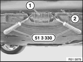 Insert special tool 51 3 330 between vehicle hoist mounting (1) and vehicle underbody (2) and remove.