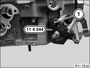 Fit special tool 11 4 342 with screws (1). Screw in knurled screw in direction of arrow.