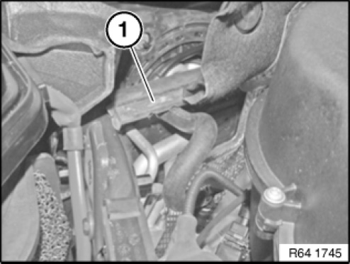 Release hose clamps (1) with special tool 17 2 050 and detach coolant hoses (2).