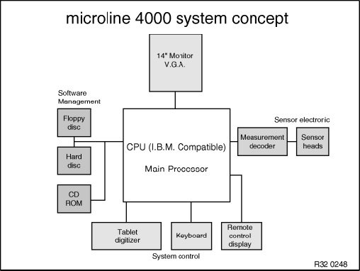 - The PC with graphic monitor and removable operating panel, supports for the measuring sensors, the remote control and the A4 printer are integrated into the workstation. The charging station is located in the cabinet and can also be connected to the measuring sensors and the remote control using the plug-in cables (operating while simultaneously charging the batteries).