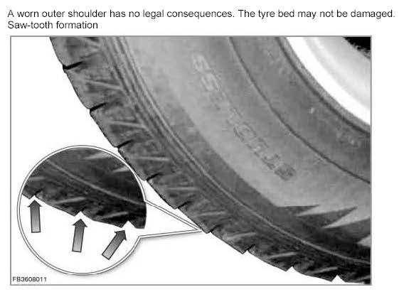 At the front tires of rear-drive vehicles, a saw-tooth-shaped wear can be partially seen. The individual blocks wear due to the slip which occurs when lifting up from the road surface due to the unloading of the inner tension. Saw-tooth-shaped wear can have an increased running noise as a result.