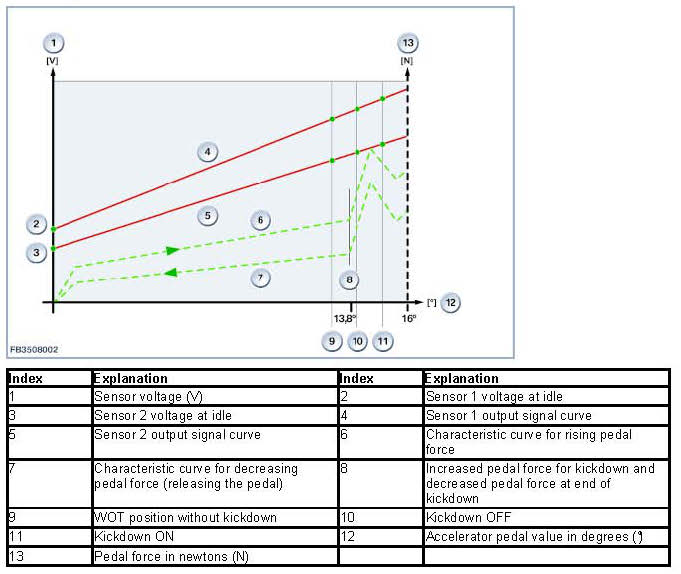 Start of kickdown phase: The detent position at which increased pedal force is required lies between a maximum of 13.8° and a minimum of 1.6° before the mechanical travel stop. On the characteristic curve for rising pedal force, the threshold value for kickdown ON must lie immediately after the maximum pedal force for kickdown.