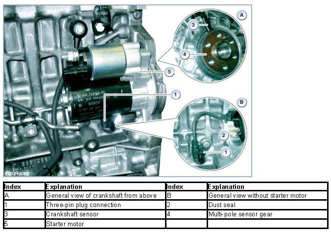 The crankshaft sensor is integrated in the radial sealing ring. The crankshaft sensor picks up the position of the crankshaft by means of a multi-pole sensor wheel bolted onto the flywheel. The Digital Engine Electronics (DME) uses this to calculate the engine speed. The camshaft sensor and the crankshaft sensor are needed for fully sequential fuel injection (fuel injection takes place individually optimized for each cylinder at the specific ignition point).