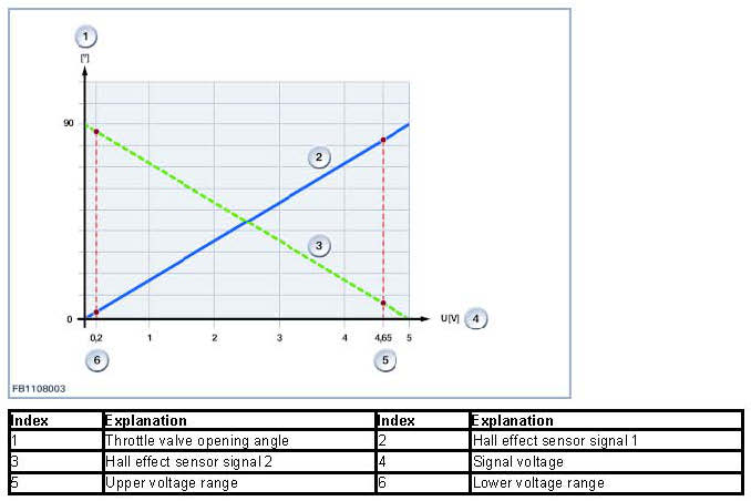 The Digital Motor Electronics (DME) receives a measured value of between 0 and 5 volts from the hall effect sensor. With the aid of the learned lower stop and a codable slope, the Digital Motor Electronics (DME) converts this voltage into the throttle valve opening angle. The diagnosis monitors the two signals with reference to a lower and upper voltage range.