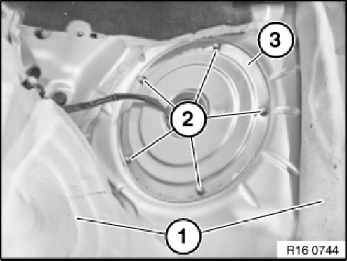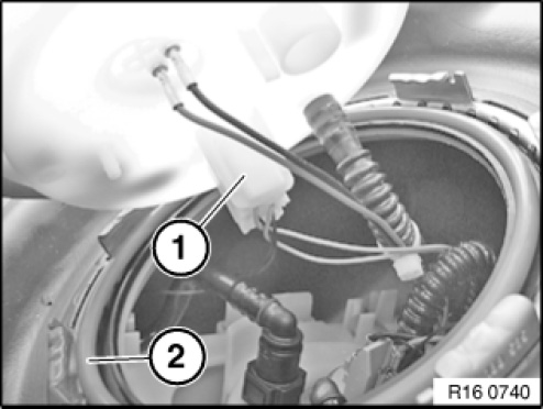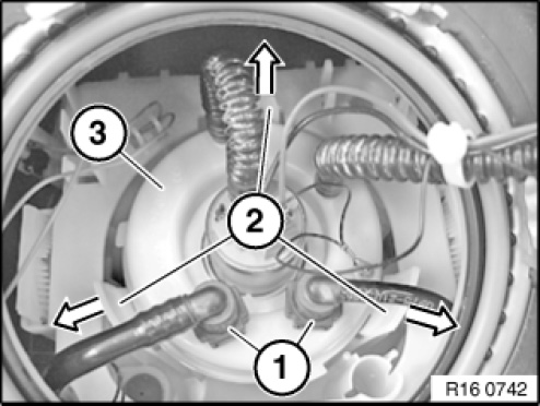 Press tabs (2) outward in direction of arrow and remove fuel pump (3) in upward direction.