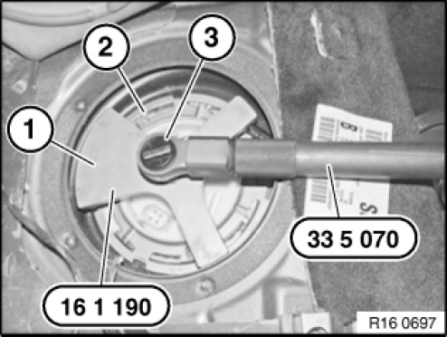 Fit special tool 16 1 190 with wide crank web (1) towards rear onto locking ring (2).