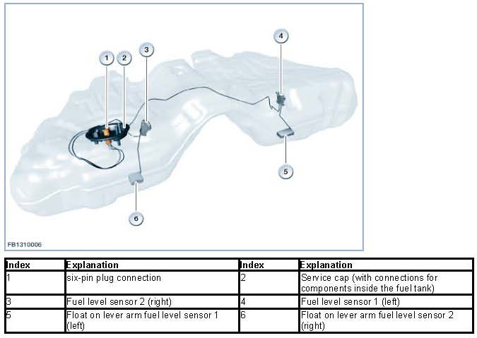 The fuel tank level is determined by the fuel level sensors and displayed on the instrument panel (KOMBI). 1 fuel level sensor consists of the following components:
