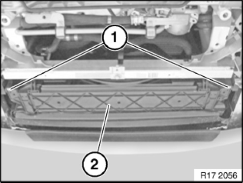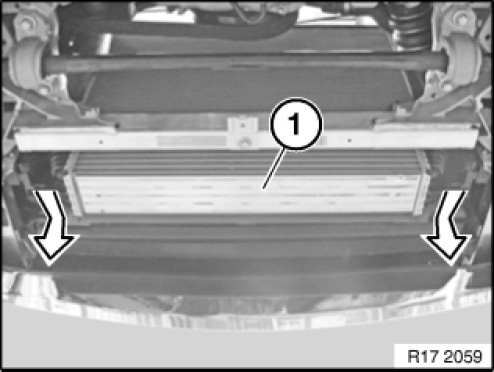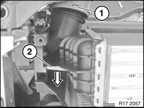 Unlock charge air cooler (1) towards front from brackets and remove towards bottom.